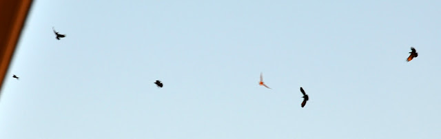 There is loud cawing behind me and five Crows come blazing, well the Crow version of blazing, over my head and aim for Goldie. Goldie has turned and the first Crow appears as well.